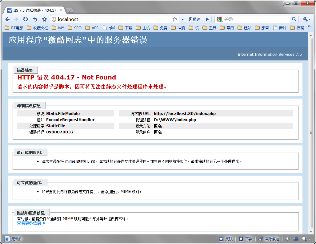 Windows Server 2008 R2 IIS7.5环境配置PHP后出现:HTTP 错误 404.17 – Not Found 请求的内容似乎是脚本,因而将无法由静态文件处理程序来处理。