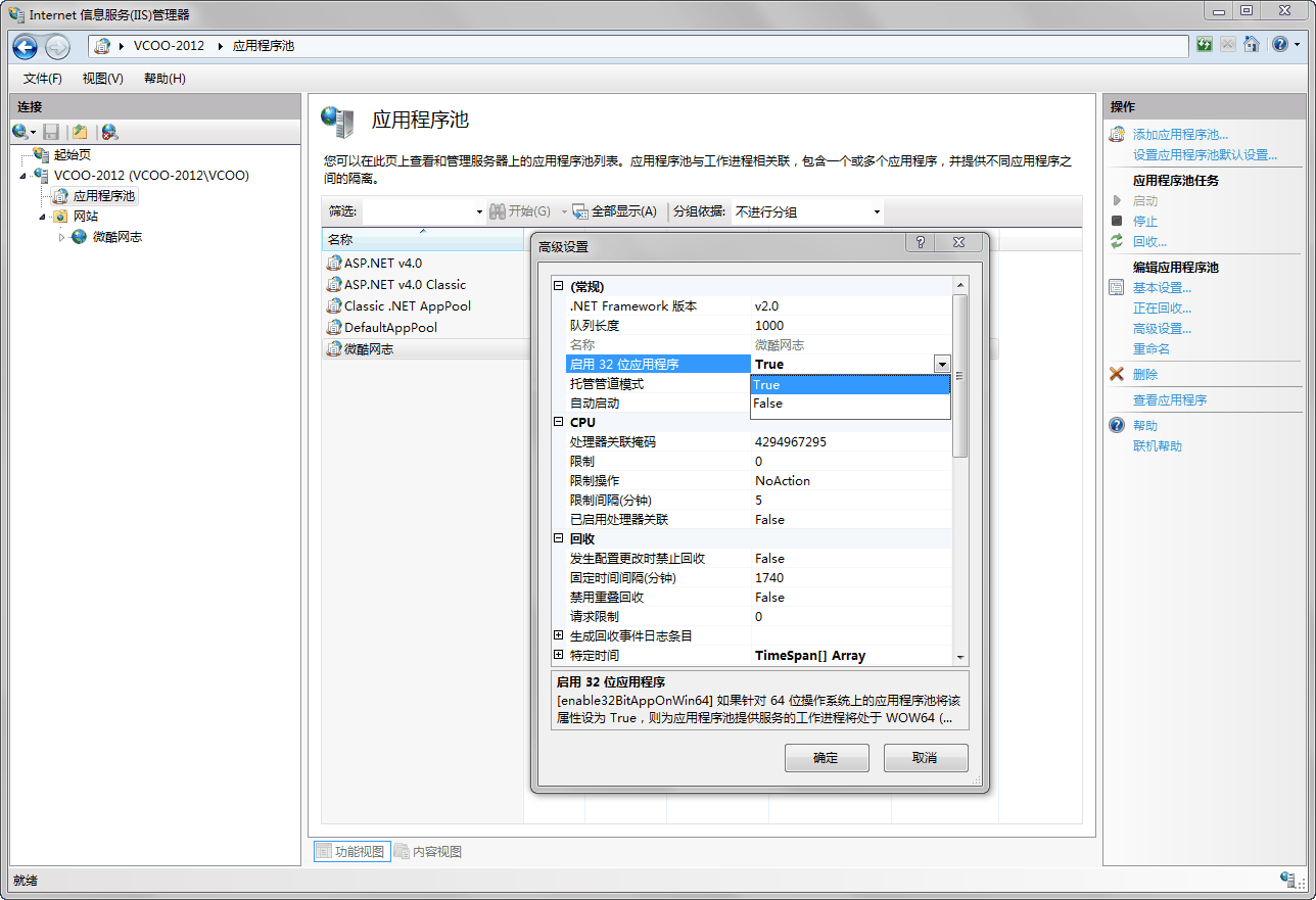 打开应用程序池,选中后点右键–高级设置,将“启动32位应用程序”改为 true
